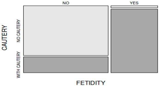 In comparing the frequency of postoperative malodor (halitosis) encountered in the patients in group A (31 out of 45 patients) to that of the patients in group B (1 out of 45 patients), there was a statistically significant difference between the groups (X-squared = 40.781, df = 1, p < 0.001. Postoperative halitosis was encountered more frequently in the patients in whom electrocautery was used intraoperatively (Figure 3).