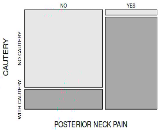 In comparing the frequency of postoperative posterior headache (neck pain) encountered in the patients from group A (34 out of 45 patients) to that of the patients in group B (2 out of 45 patients), there was a statistically significant difference between the groups (X-squared = 44.491, df = 1, p < 0.001). Postoperative neck pain (pain at the back of the child’s head) was more frequently encountered in the patients in whom electrocautery was used intraoperatively (Figure 5).