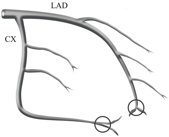 The schematic diagram shows distal landmark points for LAD and Cx. These include the distal bifurcation of the LAD, also known as the ‘moustache’, as well as the distal branch of the lateral left ventricular wall artery farthest from the coronary ostium for the Cx.