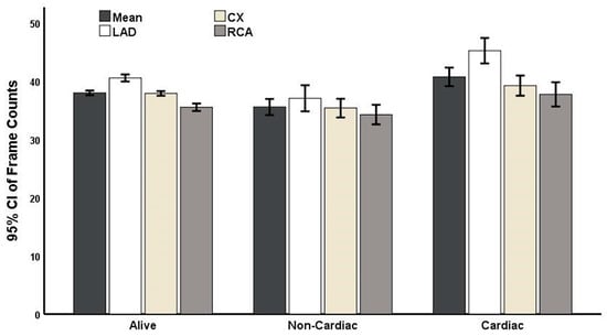 Significant differences in LAD (p < 0.001), Cx (p = 0.002), RCA, and mean TFC in patients with CV vs. non-CV causes of death were observed (Table 2).