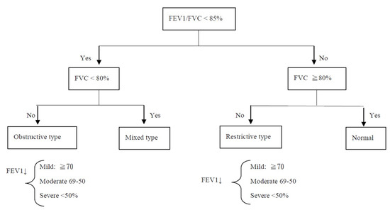 Lung functional abnormalities were classified as described in Figure 1 [8,9]. Patients with CHD were classified into five groups: atrial septal defect (ASD), ventricular septal defect (VSD), tetralogy of Fallot (TOF), transposition of the great arteries (TGA), and other diagnoses. Patients were classified into two groups: acyanotic CHD and cyanotic CHD. Cyanotic CHD involves heart defects that reduce the amount of oxygen delivered to the rest of the body, whereas acyanotic CHD does not interfere with the amount of oxygen or blood delivered to the rest of the body [10,11]. Patients were also classified into two other groups: those who received the Fontan procedure and those who received other procedures. The spirometry assessment data among these groups were analyzed and compared.