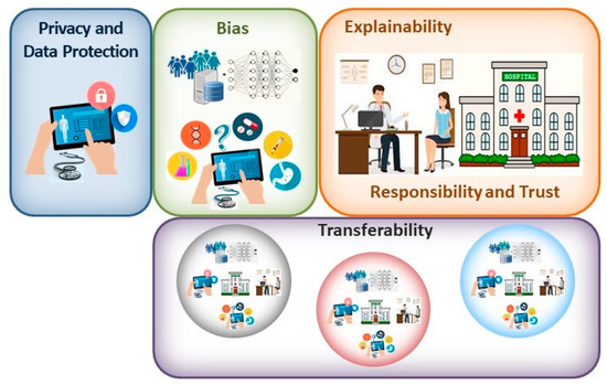 Ensuring the privacy of medical information is increasingly challenging in the digital age. Not only are electronic data easily reproduced, but they are also vulnerable to remote access and manipulation, with economic incentives intensifying cyberattacks on health-related organisations [35]. Breaches of medical confidentiality can have important consequences for patients. Indeed, they may not only be responsible for the shaming or alienation of patients with certain illnesses, but they could even perhaps limit their employment opportunities or affect their health insurance costs. As medical AI applications become more common, and as more data are collected and used/shared more widely, the threat to privacy increases. The hope is that measures such as de-identification will help maintain privacy and will require this process to be adopted more generally in many areas of life. However, the inconvenience associated with these approaches makes this unlikely to occur. Moreover, re-identification of de-identified data is surprisingly easy [36], and thus, we must perhaps accept that introducing clinical AI applications will compromise our privacy a little. This would be more acceptable if all individuals had the same chance of benefitting from these tools, in the absence of any bias, but at present, this does not appear to be the case (see below). While some progress in personal data protection has been made (e.g., General Data Protection Regulation 2016/79 in the E.U. or the Health Insurance Portability and Accountability Act in the USA: [37,38]), further advances with stakeholders are required to specifically address the data privacy issues associated with the deployment of AI applications [39].