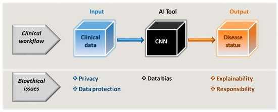 As part of the clinician’s workflow and decision-making process, the AI tools driven by CNNs can be considered a black box subject to data bias. As such, the AI tool itself cannot be allowed to introduce bias through its very design or to exacerbate any bias inherent to the input data used. The model input is essentially the patient’s clinical (or clinically related) data, which is subject to the constraints of privacy and data protection. As a consequence of using the tool, the clinician will extract information regarding the patient’s disease status and they must be in a position to be able to accept and explain the output of the model, and along with the healthcare providers, accept the same level of responsibility for this as would be expected in any clinical workflow.
