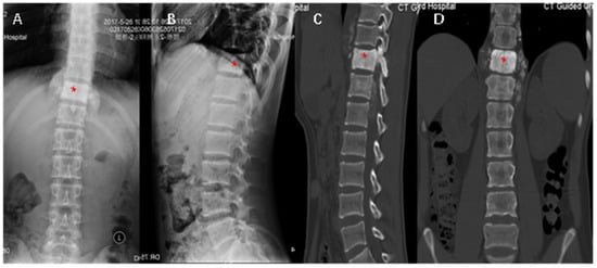 X-ray films (A,B) and CT images (C,D) showed the high-density osteogenic changes (* in red) in the T11 vertebrae body (A–D) and appendages (C,D), and those involved with the upper and lower stages of the spinal canal (C,D).