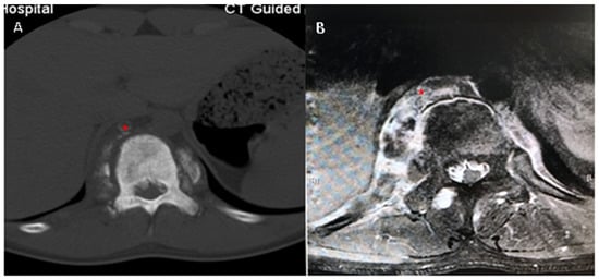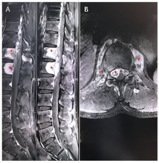Abnormal signals were found in T11, T12 and the corresponding spinal canal in contrast-enhanced magnetic resonance images both in sagittal (A) and axial images (B) (T1-weighted imaging). Tissues suspected of being tumors can be significantly enhanced in MRI images (* in red). Part of the spinal canal was occupied by the lesion and the dura sac was obviously compressed.