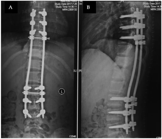 Anterior−posterior (A) and lateral X-ray (B) after palliative decompression surgery of the patient with CMF-OS.