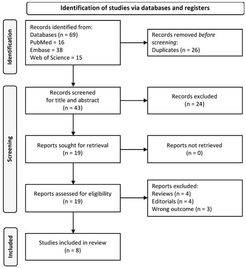 A total of 43 records were retrieved after duplicate removal. We excluded 24 records based on title and abstract screening and further excluded 11 records due to full-text evaluation (4 reviews, 3 editorials and 4 articles with different outcomes). Finally, eight eligible papers were included in this review. Figure 1 shows the flow chart of the selection process.