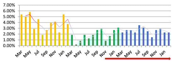 The percentage of adnexectomies by month among the total number of adnexectomies (%). A downward trendline can be observed for the percentage of adnexectomies performed during the SARS-CoV-2 pandemic. Orange—PP: the year before the SARS-CoV-2 pandemic; green—P1: the first year of the SARS-CoV-2 pandemic; blue—P2: the second year of the SARS-CoV-2 pandemic; red arrow—PV: post-vaccination period.