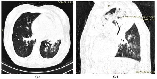 Her medical history revealed an admission in a county hospital in October 2018 for general malaise, malnutrition, pale skin, fever, left thoracic pain, cough, difficulty in expectoration, then hemoptysis, and dyspnea. Chest radiographs (Figure 1) revealed a relatively homogeneous opacity in the upper left pulmonary lobe. Chest Computer Tomography (CT) showed alveolar consolidation of the left upper pulmonary lobe, minimal bilateral pleural effusion, a nodule in the upper right pulmonary lobe, and mildly pericardial fluid accumulation (Figure 2a,b).