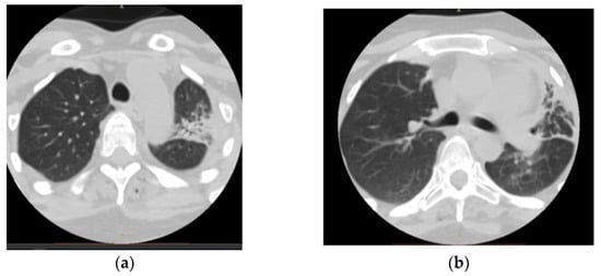 On admission, a chest computed tomography (CT) revealed atelectasis and a solid nodule surrounded by a halo of ground-glass attenuation in the left lung, representing the “CT halo sign” (Figure 3a,b).