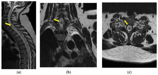 MRI of the cervical spine T2-weighted image—sagittal (a), coronal (b), and axial (c) sections: cord expansion with a decreased signal from abscess core and increased signal from surrounding edema. The yellow arrow indicates the expansive cystic intramedullary process.