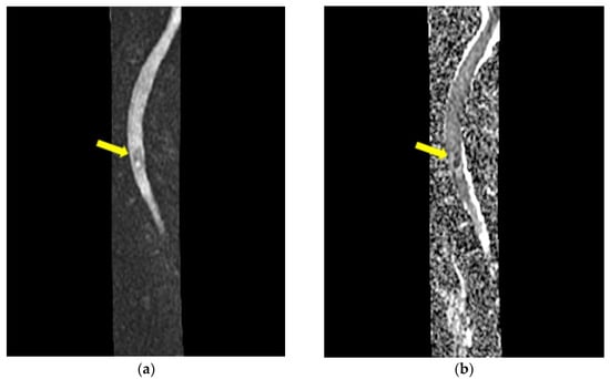 MRI of the cervical spine—sagittal DWI (a) and ADC map (b): the lesion is hyperintense on DWI, and restricted diffusion is illustrated on ADC map. The yellow arrow indicates the expansive cystic intramedullary process.