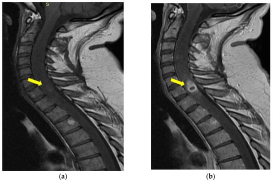 MRI of the cervical sagittal spine T1-weighted image (a) and after intravenous Gd-chelates (b): ring-enhancing mass within cord. The yellow arrow indicates the expansive cystic intramedullary process.