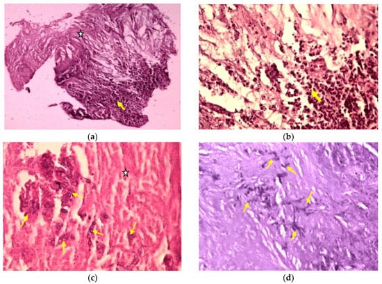 Microphotographs: (a) Spinal cord histological architecture was replaced by an extensive area of coagulative necrosis (white star), surrounded by dense acute inflammatory infiltrate (yellow arrow) (HE, ×100). (b) The same histological area with a higher magnification showed the necrotic area being surrounded mainly by numerous neutrophils (yellow arrow) (HE, ×400). (c) Another specimen showed extensive coagulative necrosis with clusters of hyphae inside (HE, ×400). (d) The same histological area, stained with Periodic acid–Schiff (PAS) staining method, showed colonies of dichotomous angle branching hyphae of Aspergillus spp. embedded in the necrotic material (PAS, ×200).