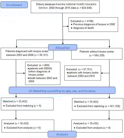 We included 624,646 patients who were aged 60 years and above in 2002 in this study. The exclusion criteria include patients who had already been diagnosed with HZ before 2002 or those who had died during the follow-up period (n = 4196). The patients were divided into two groups: those who had received the first diagnosis of HZ (ICD-10: B02) and received any treatment between 2003 and 2008 (group H, n = 36,121), and those without a diagnosis of HZ (group C, n = 584,329). We followed the medical records of the study participants for a minimum of 7 years and a maximum of 13 years. The occurrence of SSNHL in the patient was confirmed by ICD-10: H912. It is defined as the sudden onset of hearing loss of at least 30 dB in three consecutive frequencies in an audiometry test within 72 h. Among them, only patients who underwent an audiometry test were included. In group H, patients who had been diagnosed with SSNHL prior to a diagnosis of HZ or who had died between 2003 and 2008 were excluded (n = 669). In group C, those newly diagnosed with HZ between 2009 and 2015 were excluded (n = 97,751). Finally, 1:1 matching between the two groups was achieved according to age, sex, and income (n = 35,452), as shown in Figure 1. To avoid selection bias when matching the participants, the control group participants were sorted using a random number order and were randomly selected.