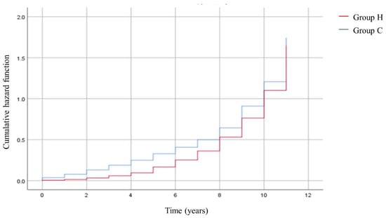 Table 3 shows the incidence of SSNHL according to the follow-up period in the elderly database. A stratified analysis of the number of SSNHL cases by follow-up period showed that the cumulative incidence of SSNHL was significantly lower in group H than in group C within five years after the diagnosis of HZ (p < 0.005). However, Table 3 shows that the incidence of SSNHL was significantly higher in group H five years after the diagnosis of HZ (p < 0.001).