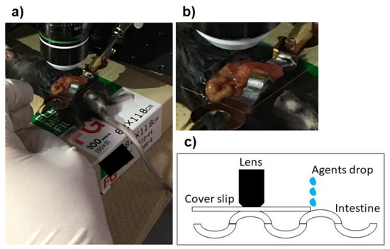 Preparation of mouse and microscope set up. A vertical skin incision is made on a deeply anesthetized C57BL/6 mouse. The intestines are exposed, and the mouse was placed on the stage of a dissecting microscope. A microscope cover glass was attached to the end of an arm of the mouse-holding device and adjusted to avoid excess pressure on the intestines (a,b). Fifty microliters of each agent were applied into the space between the surface of the intestine and the coverslip for the S group (c).