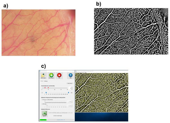 We determined the relative vascular density (VD; %) as the percentage of vascular area to the non-vascular area in the fixed visual field using the ImageJ software (Image processing and analysis in JAVA version 1.53 g; Wayne Rasband, NIH, Bethesda, MD, USA) and AngioTool (free software, downloaded at http://angiotool.nci.nih.gov; (accessed on 1 February 2023). The details of AngioTool were described in our earlier study [17]. Briefly, the images were converted to black–white images using the ImageJ software (Figure 2b). Each black –white image was analyzed using AngioTool and quantitative measurements of the VD were calculated automatically (Figure 2c).