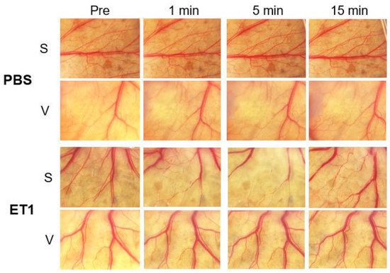 Vascular density evaluations for control agents. No obvious vascular changes were observed for PBS-applied blood vessels of the S and V groups. For the ET1-treated group, obvious vasoconstrictions were observed for the S group (second panel from the bottom) from 1 to 15 min. No obvious changes were observed for the V group (bottom panel). ET-1, endothelin-1; PBS, phosphate-buffered saline.