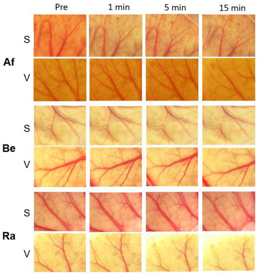 Raw images of anti-VEGF-treated groups are shown in Figure 4. No obvious vascular changes were observed for the S and V groups after each anti-VEGF treatment. The mean VD of the bevacizumab-treated S group was 46.1 ± 0.4% at the baseline, 46.7 ± 0.4% at 1 min, 46.7 ± 0.4% at 5 min, and 46.3 ± 0.6% at 15 min. None of the changes was significant (Table 2, p = 0.70). The mean VD of the ranibizumab-treated S group was 44.7 ± 1.3% at the baseline, 45.0 ± 2.1% at 1 min, 44.7 ± 2.1% at 5 min, and 44.6 ± 2.6% at 15 min. None of the changes was significant (p = 0.95). The mean VD of the aflibercept-treated S group was 46.5 ± 1.2% at the baseline, 46.2 ± 0.9% at 1 min, 45.9 ± 1.1% at 5 min, and 46.1 ± 1.3% at 15 min. None of the changes was significant (p = 0.70).