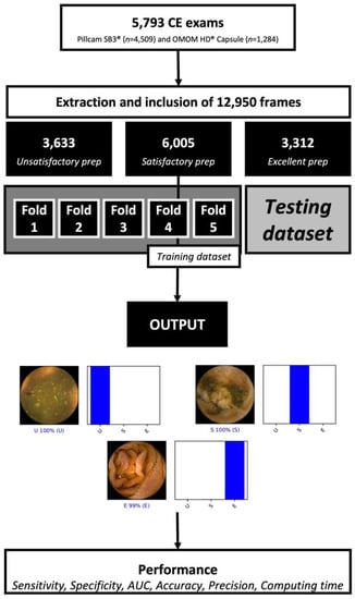 The CE images obtained from the examination of patients (n = 4319) between 2015 and 2022 at the São João University Hospital (Porto, Portugal) and the Manoph Gastroenterology Clinic (Porto, Portugal) were reviewed retrospectively in this study. These patients were referred for CE examinations as a result of detecting indications of a small-bowel disorder or for the monitoring of any confirmed small-bowel diagnosis. The complete video of the examinations performed was reviewed, extracting 12,950 images of the SB mucosa in total. A total of 3 experienced gastroenterologists (M.M.S., H.C. and A.P.A), experts in SB-CE who had each reviewed over 1500 CE examinations before the start of this study, carried out the inclusion and labeling of frames. The three experts in CE analyzed the still frames independently and scored the quality of SB cleansing based on the proportion of mucosa visualized and in accordance with the degree of obscuration by bubbles, bile and/or debris. The images were selected from an ever-growing CE images database. Accordingly, the quality of SB cleansing in each still frame was categorized as excellent (E) when ≥90% of the mucosa was visible, satisfactory (S) when 50% to 90% of mucosa was visible, and unsatisfactory (U) when <50% of the mucosa was visible. This classification was irrespective of the presence or absence of any endoscopic lesions. The final labeling of each frame required the agreement of all three experts regarding the quality of bowel preparation. Frames in which a consensus was not reached were not included in the analysis to ensure that the frames studied were correctly labelled.