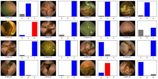 Output obtained by implementing the CNN. The bars represent the probability estimated by the network and the finding with the highest probability was considered to be the predicted classification output. The blue bar represents a correct prediction: E, excellent bowel preparation (≥90% of the mucosa visualized); S, satisfactory bowel preparation (50–90% of the mucosa visualized); U, unsatisfactory bowel preparation (<50% of the mucosa visualized).