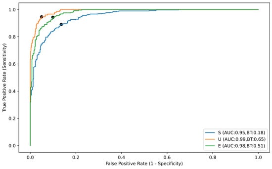 Receiver operating characteristic (ROC) curve of the convolutional neural network’s performance in differentiating the small-bowel preparation classes: AUC, area under the ROC curve. (BT—best threshold).