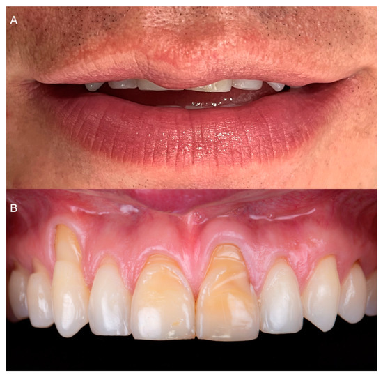 A 32-year-old male patient presented to the clinic indicating that he did not like the esthetics of his anterior teeth (Figure 1A,B).