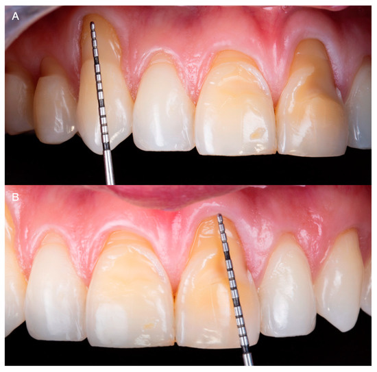 Initial intra-oral situation. (A) Measurement of Miller Class 1 recession on the maxillary right canine. (B) Measurement of Miller Class 1 recession on a maxillary left central incisor.