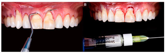 On the day of the surgery, bilateral anterior superior alveolar, nasopalatine, and left greater palatine blocks were performed with Lidocaine 2% with 100,000 units of epinephrine (Lignospan Standard; Septodont, Saint-Maurdes-Fosses, France). Subsequently, the tunneling procedure was performed from maxillary right first premolar to maxillary left lateral tooth; a partial thickness dissection was performed using periodontal microsurgical instrumentation. Additionally, the root surfaces were mechanically debrided and the smear layer was chemically removed using 24% ethylenediaminetetraacetic acid (EDTA) gel (Straumann PrefGel; Straumann, Basel, Switzerland) for 2 min, followed by abundant irrigation with saline solution (Figure 3A,B).