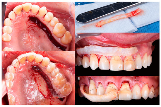 Subsequently, a partial thickness flap was reflected approximately 4–5 mm from the lingual marginal gingiva of the maxillary right second molar, extending to the lateral tooth in the same quadrant. A 55 × 5 mm band of connective tissue was obtained from the glandular and adipose regions of the palate. During the harvesting procedure, absolute care was taken to preserve the periosteum of the donor site. Subsequently, the connective tissue graft was trimmed to fit the receptor sites (Figure 4A,B) and was inserted and secured below the partial thickness anterior flaps apical to the cementoenamel junction of the anterior teeth with 5-0 monofilament nylon sutures (5-0 Ethilon; Ethicon, Raritan, New Jersey, NJ, USA) (Figure 4C–E).