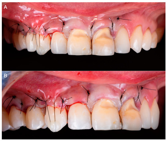 Additional vertical suspensory extending from the base of each interdental papilla to coronal anchorage points were created using flowable composite (3M Filtek Supreme Flowable Composite; 3M ESPE, St Paul, MN, USA). The suspensory sutures were carefully placed to secure the gingival graft, maximize graft coverage, and maintain the height of the interdental papillae (Figure 5A,B).