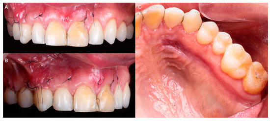 The surgical sites were reevaluated 48 h, 2 weeks, and 1 month after surgery. At this stage, satisfactory root coverage and adequate healing with complete reepithelization of the donor site were observed clinically (Figure 6A–C).