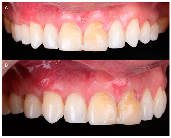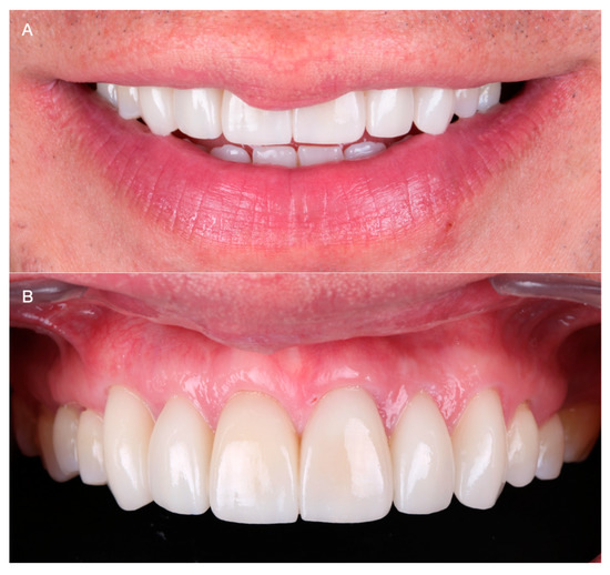 Subsequently, impressions were made with irreversible hydrocolloid (Geltrate, Dentsply Sirona, Fair Lawn, NJ, USA) and diagnostic casts were fabricated with type III dental stone (Buff Stone; Whip Mix Corp, Louisville, KY, USA). Using the contours of the diagnostic casts as reference, 6 lithium disilicate (E.max CAD; Ivoclar Vivadent, Schaan, Liechtenstein, Switzerland) ceramic veneers were fabricated using a professional computer-aided design and computer-aided manufacturing (CAD-CAM) dental software (Exocad, Exocad GmbH; Darmstadt, Germany) (Figure 8A,B). Subsequently, the restorations were tried intraorally and the interproximal contact and margins were assessed and carefully adjusted. After complete seating was achieved, the restorations were etched for 20 s with hydrofluoric acid (IPS Ceramic Etching Gel; Ivoclar Vivadent, Schaan, Liechtenstein, Switzerland), primed (MonoBond Plus; Ivoclar Vivadent, Schaan, Liechtenstein, Switzerland), and cemented with resin-based cement (MultiLink Automix; Ivoclar Vivadent, Schaan, Liechtenstein, Switzerland) (Figure 9A,B).