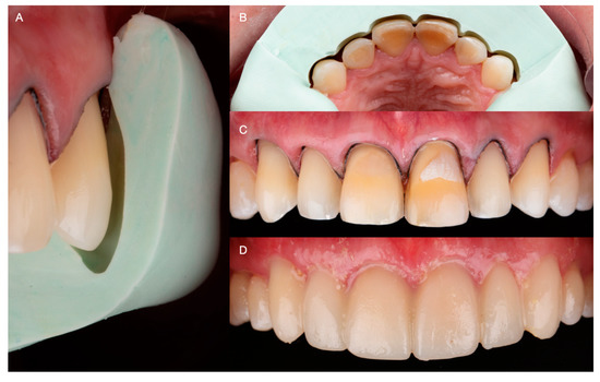 Ceramic restorations are a well-supported treatment that can improve the patient’s self-esteem and social interactions [1,14]. Modern dental ceramics possess mechanical and chemical properties, making them excellent restorative materials. Feldspathic and glass-infiltrated ceramics can be bonded to the enamel using an adhesive hybrid layer [18] and have a modulus of elasticity similar to the enamel, making them a suitable “biomimetic” alternative to replace lost enamel [14]. In the present clinical report, the teeth were minimally prepared using the desired restorative contours established with a diagnostic wax-up as a reference. This step was critical to ensure that the tooth preparations preserved as much enamel as possible to guarantee adequate union between the restoration and the substrate, and to provide enough space to fabricate esthetic and structurally durable restorations.