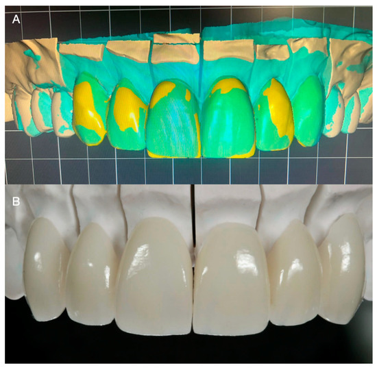 (A) Digital design of the veneers. (B) Finished ceramic veneers.