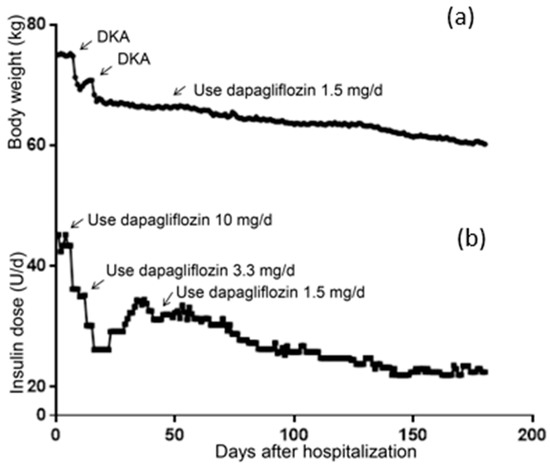 We reported that a T1DM patient presented DKA as a complication of dapagliflozin (10 mg/d and 3.3 mg/d), while a 1.5 mg/d dose of dapagliflozin resulted in better glycemia control, with a significant reduction in daily insulin dosage and gradual weight loss, without the occurrence of significant hypoglycemia or DKA. The appropriate dose of SGLT2 inhibitors is critical for patients with T1DM in terms of striking the correct balance for the patients’ therapy, considering the benefits and risks.
