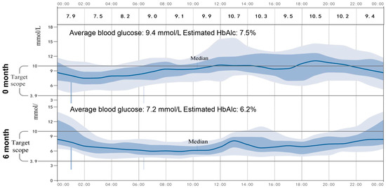 Average daily blood glucose graph. The CGM continued for 14 days, the average daily blood glucose changes graph at day 0 and after 6 months was showed.
