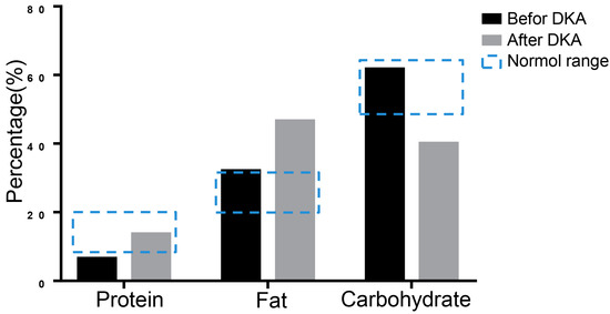 16S rRNA sequencing was performed to evaluate nutrition metabolism 3 days before the patient’s hospitalization and during the first DKA using stool specimens by Shanghai Biozeron Company. Due to the reason that the three major nutrients of the nutrition metabolism are critical in diabetes and ketoacidosis pathology, we mainly analyzed changes in the proportion of protein, fat, and carbohydrates. To the sequencing data we performed a function analysis to predict the microbiome-related content of the nutrient metabolism using Picrust software. The results showed that the protein ratio was 6.41% before DKA, which was below the normal range, and the ratio of fat and carbohydrates was not significantly abnormal. When DKA occurred, the balance between carbohydrates and fat shifted to fat metabolism (Figure 3).