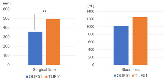 Surgical time and blood loss in both groups. ** p < 0.01.