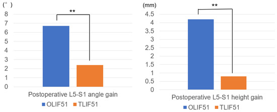 Postoperative L5-S1 angle and height gain in both groups at final follow-up. ** p < 0.01.