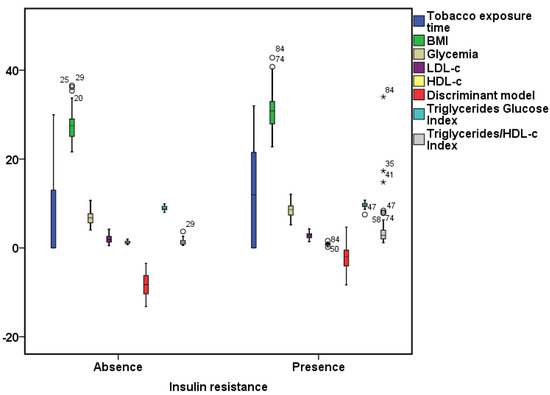 As for the limitations of this study, it must be recognized that it may present a certain bias because the individuals were evaluated only once, and the intra-individual biological variability of the biochemical and clinical determinations could not be minimized. Despite the fact that insulin resistance is related to weight, lipids, and smoking, it is known that other parameters have correlations such as high-sensitivity C-reactive protein, reactive oxygen species, uric acid [4] adipokines [28], or other parameters that were not taken into account, and this should be considered when interpreting the results. It is suggested that future studies carry out investigations that use a hyperinsulinemic-euglycemic clamp and try to determine the a priori value of the discriminant model in the diagnosis of IR in patients with type 2 DM.