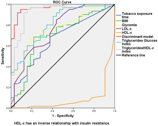 ROC curve for the different variables, discriminant model, Triglycerides/Glucose Index, and Triglycerides/HDL-c Index in order to distinguish between patients with and without insulin resistance.