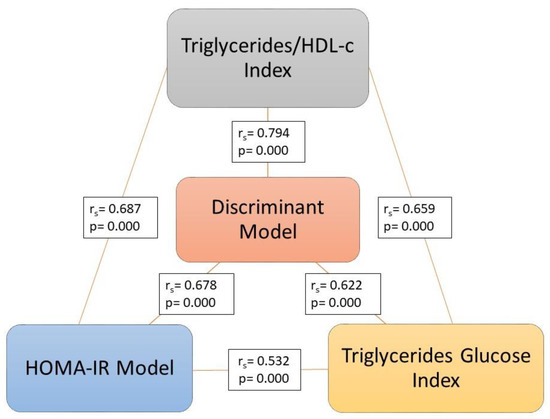 Correlation between the discriminant model, Triglycerides/Glucose Index, Triglycerides/HDL-c Index, and HOMA-IR.