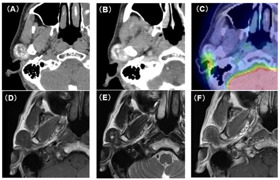 Computed tomography (CT) showed an oval tumor in the region of the right TMJ, extending to the upper pole of the parotid gland. The tumor was oval-shaped with an actual width of 2.5 cm and a length of 3 cm. It had well-defined borders and a diffuse hyper-absorptive zone within, which indicated diffuse calcification (Figure 1A,B). Positron emission tomography with 18F-fluorodeoxyglucose (18F-FDG-PET) showed a mild uptake of 18F-FDG (SUVmax = 3.25) (Figure 1C). There was no uptake in other sites except for physiological uptake. The tumor showed a poor contrast effect with iodine-based contrast medium. A magnetic resonance image (MRI) showed a well-defined mass in the upper pole of the right parotid gland. T1-weighted images showed a low-signal tumor (Figure 1D), while T2-weighted images showed a low-signal tumor with a macular high-signal area (Figure 1E). The contrast effect of gadolinium was poor (Figure 1F). Fine-needle aspiration cytology confirmed only neutrophils and histiocytes; there were no definitive findings.