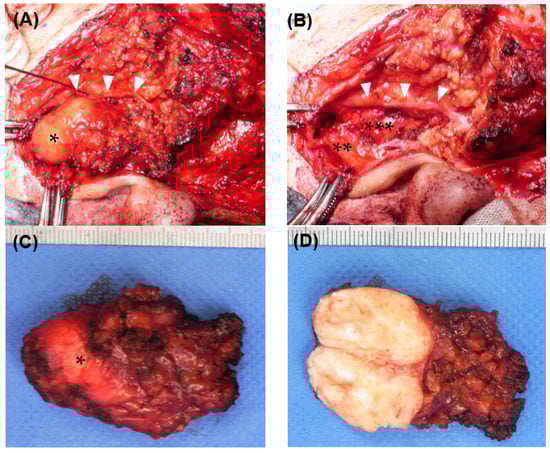 Intraoperative findings (A) Tumor exposure. The tumor (*) was located at the upper pole of the parotid gland. The temporal branch of the facial nerve (white arrowheads) runs widely along the anterior side of the tumor. (B) After tumor resection. The tumor was in contact with the external auditory canal cartilage (**) and mandibular condyle (***), but there was no obvious adhesion. The temporal branch of the facial nerve (white arrowheads) was preserved. (C) The resected tumor. It was 25 mm in length and 15 mm in width. Although half of the cranial side was exposed, the tumor was encapsulated with a rigid capsule (*). (D) The tumor section. There were numerous coarse calcifications inside the tumor.