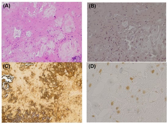 Histopathological findings. (A) HE staining. In the background of eosinophilic matrix with calcification, cells without atypia with unclear cell boundaries are scattered. Multinucleated giant cell and lymphocyte infiltration are observed. (B) DFS staining. The DFS staining is negative. There is no evidence of amyloid deposition. (C) Kossa staining. Calcified materials are identified in black. (D) S100 staining. Some tumor cells are weakly positive for S100 protein.
