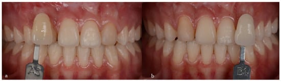 Photos of the bleaching treatment: (a) initial color (A3 on the Vita Classical scale); (b) final color (B1 on the Vita Classical scale).