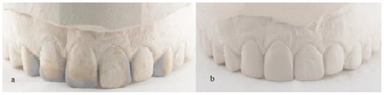 (a) Analog waxing; (b) copy of the wax-up for making the transparent matrix for treatment with the injectable composite resin technique.