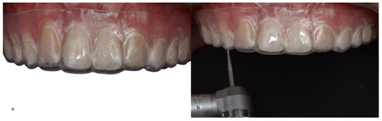 (a) Transparent matrix positioned over the patient’s teeth. (b) Drilling with diamond burs to open small holes in the transparent matrix.